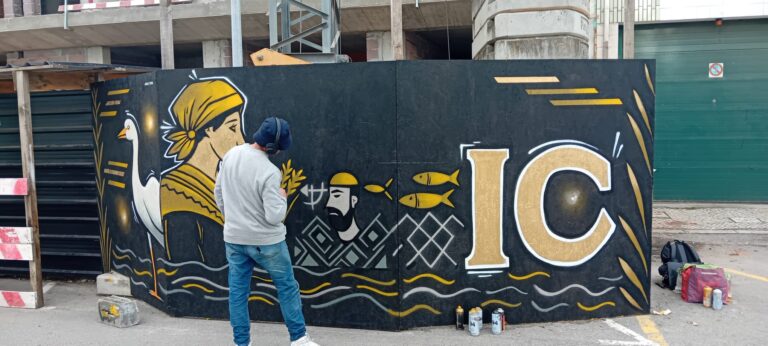 O painel, de fundo negro e linhas douradas, é uma ode à cidade: à sua Ria, ao seu mar, às suas gentes. No centro, a garça-real (Ardea cinerea) — ave emblemática da Ria e dos canais que circundam Aveiro — olha para o lado, como se estivesse a vigiar o futuro que se ergue atrás dela. À direita, três homens, vestidos com chapéus de trabalho, remam num moliceiro carregado de peixe — evocando a pesca tradicional, o esforço diário, a luta contra o vento e as ondas. Ao lado, uma figura feminina, de lenço na cabeça, segura as mãos juntas, como quem espera — talvez a saudade daqueles que partem ou a memória dos que já não voltaram. Entre eles, ondas estilizadas, pássaros em voo e o próprio nome “ICON”, em letras douradas e robustas, como um selo de pertença.