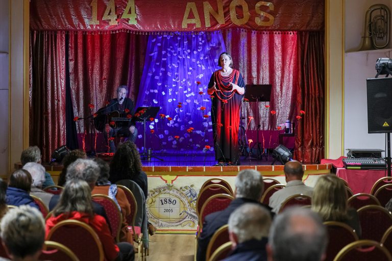 A iniciativa “Elas Encheram as Ruas de Cravos“, que decorreu na sala de espetáculos da Sociedade Filarmónica Providência, em Vila Fresca de Azeitão, proporcionou um evento intimista, com leitura encenada de poemas por Célia David e música por João Fernandez, com guitarra e voz.