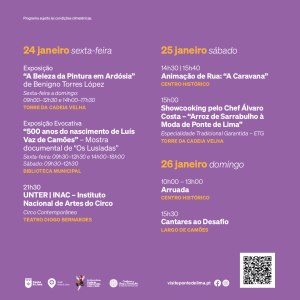 A programação que completa o convite que promete atrair locais e visitantes a desfrutar do fim de semana na vila mais antiga de Portugal. Desde a animação de rua “A Caravana” que percorrerá as ruas do Centro Histórico, no sábado das 14h30 às 15h20 e novamente das 15h40 às 16h30; ao showcooking do Chef Álvaro Costa junto à Torre da Cadeia Velha, às 15 horas; à tradicional arruada pelo Centro Histórico, no domingo das 10 horas às 13 horas; terminando com os Cantares ao Desafio, às 15h30 no Largo de Camões.
