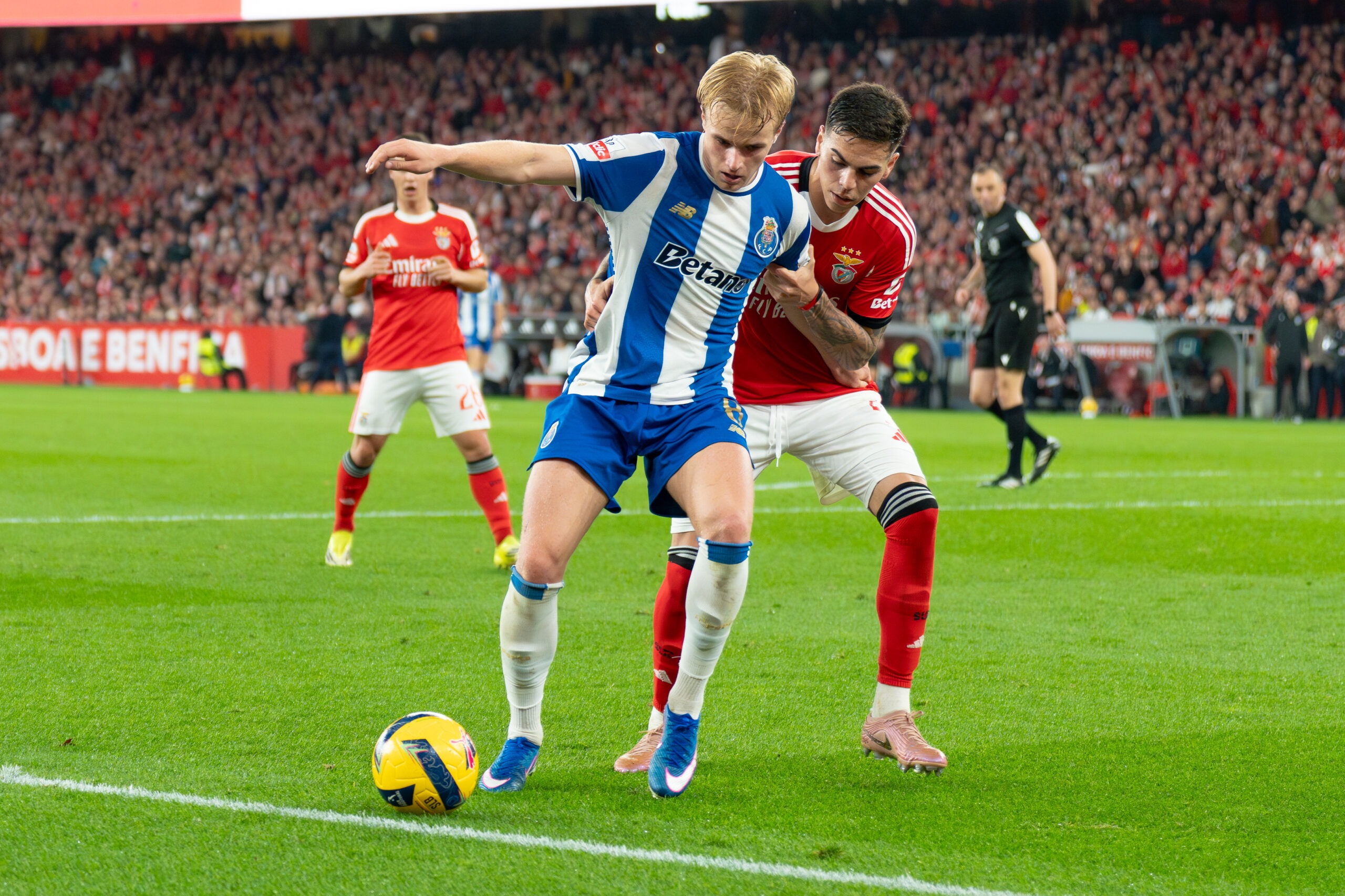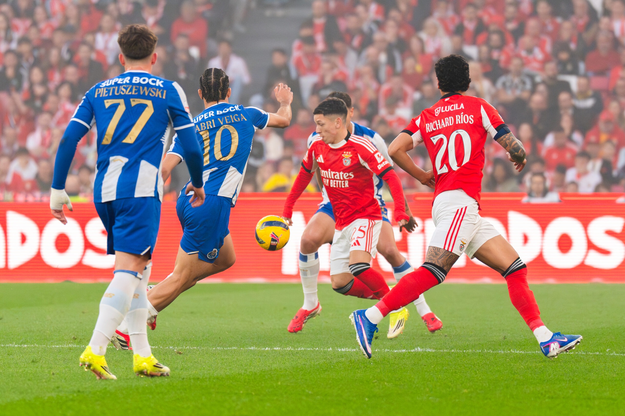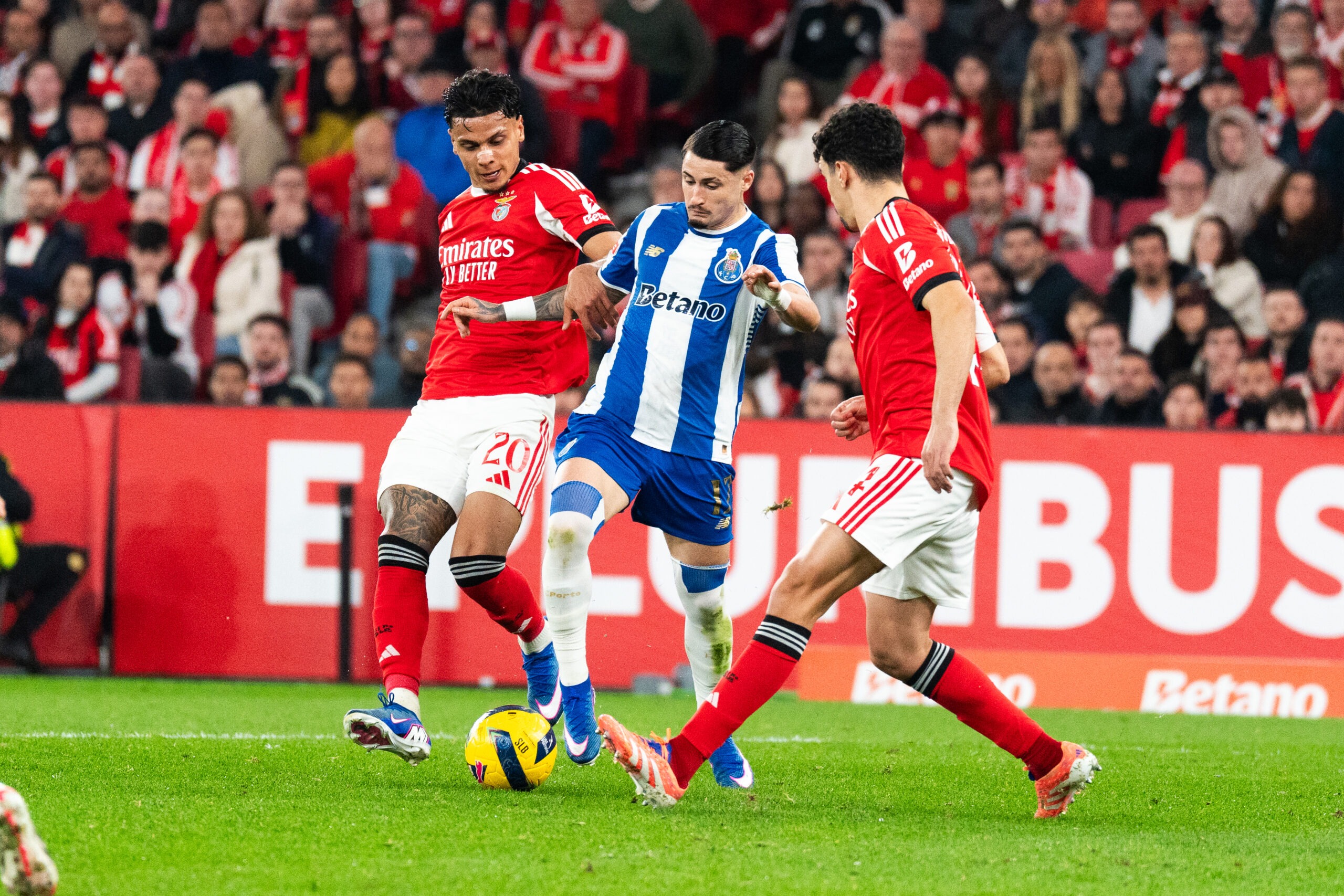 O Benfica percebeu as contas. E vai daí, imprimiu ao jogo um ritmo frenético, tentando encostar o FC Porto às cordas desde muito cedo. Rafa, Prestianni e Schjelderup – principalmente o primeiro – davam ao meio campo dos lisboetas uma velocidade estonteante. Porém, com pouco critério no momento de decidir.