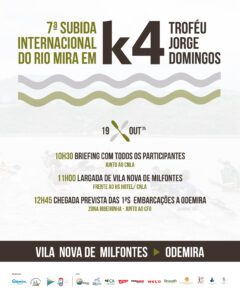 O Rio Mira será palco, no dia 19 de outubro, da 7ª Subida Internacional em K4 – Troféu Jorge Domingos, uma regata que ligará Vila Nova de Milfontes a Odemira e que reunirá mais de 100 atletas em representação de diversos clubes nacionais e internacionais.