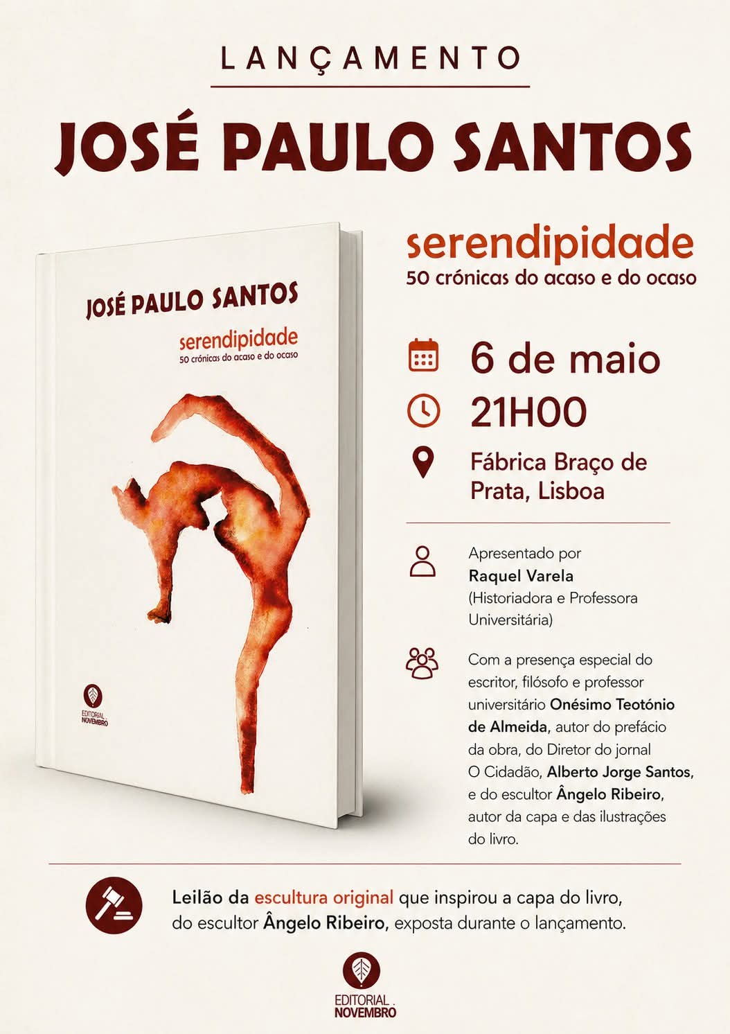 Agenda Serendipidade – Novo livro de José Paulo Santos vai ser lançado em Lisboa Terá lugar na Fábrica de Braço de Prata, no dia 6 de Maio, às 21 horas. Por O Cidadão 28 de Abril, 2026 38 Partilhar LinkedinXFacebookO emailWhatsApp Mais artigos Pinhal Novo Market abre de maio a setembro 28 de Abril, 2026 Viseu | Festival Humor à Lafões recebe noites de stand-up comedy 25 de Abril, 2026 Ponte de Lima | tradição dos “Maios” mantém-se viva 24 de Abril, 2026 Oeiras | Transferência de Competências em Educação para Municípios em debate 22 de Abril, 2026 Leiria | Fórum Emprego e Formação com presença do IEFP 21 de Abril, 2026 Odemira | Brisas do Atlântico regressam a 10 de junho 19 de Abril, 2026 Atlântico Business School realiza Feira das Empresas em Gaia 17 de Abril, 2026 Srendipidade. Direitos Reservados O livro – Serendipidade – inclui textos do autor, publicados no jornal O Cidadão, durante cerca de um ano. São artigos que versam diversas temáticas, com relevo para a Filosofia e questões sociais. O Cidadão TagsBraço de PrataJosé Paulo SantoslançamentoLisboalivroO CidadãoSerendipidade Partilhar LinkedinXFacebookO emailWhatsApp Artigo anteriorAgricultores lançam petição contra Campo de Tiro da Força AéreaPróximo artigoSetúbal | Novo Pavilhão das Manteigadas inaugurado com exibições desportivas - Publicidade - - Publicidade - Artigos mais recentes Setúbal | Novo Pavilhão das Manteigadas inaugurado com exibições desportivas 28 de Abril, 2026 Valongo| Amado Martins e Andreia Santos venceram Grande Prémio de Atletismo em Campo 28 de Abril, 2026 Portugal inicia Mundial de Equipas em ténis de mesa 28 de Abril, 2026 São Roque chega à final do play-off de ténis de mesa 27 de Abril, 2026 Sporting empata nas Aves e deixa FC Porto a um triunfo do título 27 de Abril, 2026 - Publicidade -