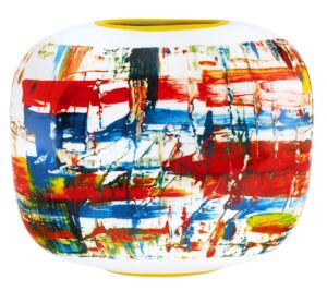 As composições visuais que decoram a porcelana reinterpretam formas e cores da lezíria natal e das viagens marítimas de Macedo, agora transpostas para um objeto tridimensional. A intensidade da paleta cromática reforça a energia vibrante da sua obra.